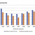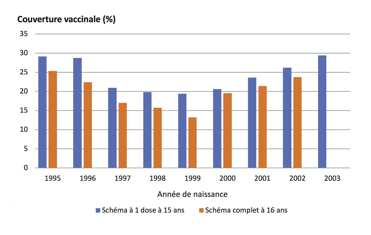 Tous ces points ont participé à une large défiance vis-à-vis de cette vaccination et donc à une couverture vaccinale insuffisante. En France, le suivi de la couverture vaccinale apportée par les vaccins contre les papillomavirus est réalisé à partir de « l’échantillon généraliste des bénéficiaires » (Caisse nationale d’assurance maladie des travailleurs salariés/Santé publique France) chez les jeunes filles éligibles à la vaccination, soit les jeunes filles nées depuis 1993 (14 ans en 2007). En décembre 2018, la couverture vaccinale chez celles âgées de 16 ans (nées en 2002) est de 23,7 % (v. figure ) alors que l’objectif fixé dans le Plan cancer 2014-2019 était d’atteindre une couverture vaccinale de 60 % chez les filles de 11 à 14 ans révolus. Or, depuis l’introduction de cette vaccination dans le calendrier vaccinal, la couverture vaccinale n’a jamais dépassé 30 %, en dépit des preuves de l’efficacité de ces vaccins, en vie réelle, et d’une littérature scientifique indépendante démontrant leur sécurité.14, 18