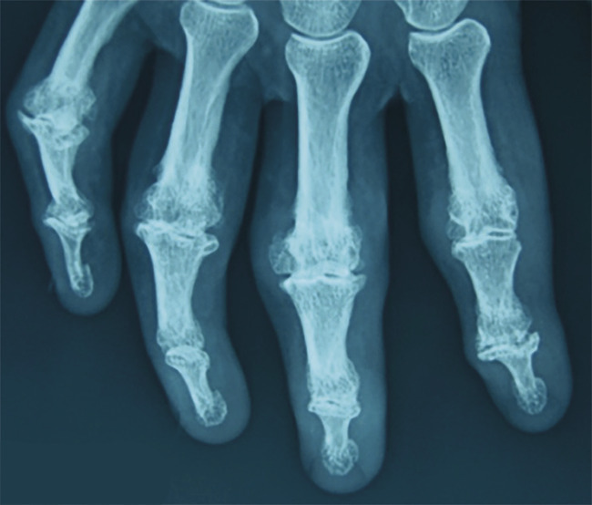 L’arthrose est très courante et peut atteindre quasiment toutes les articulations. Deuxième localisation de la maladie, les lésions digitales peuvent être trompeuses lors des poussées. Les déformations caractéristiques des interphalangiennes distales (IPD) [nodosités d’Heberden] ou moins fréquemment des interphalangiennes proximales (IPP)[Bouchard] sont d’apparition lente et bien mises en évidence sur une simple radiographie (fig. 2 ).