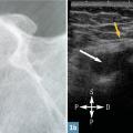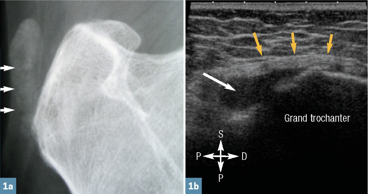 Les tendinites de l’épaule peuvent être ou non calcifiantes (le plus souvent elles concernent la coiffe des rotateurs). Celle du moyen glutéal (ou trochantérite, principale pathologie péri-articulaire de la hanche) se manifeste par des douleurs intenses à la pression du grand trochanter et à l’abduction contrariée de la hanche. Leur caractère localisé fixe majoré à la mobilisation oriente facilement le diag- nostic, qui peut être confirmé à l’échographie (fig. 1 ).