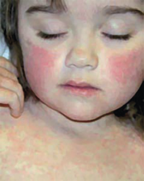 L’atteinte par le Parvovirus B19, qui n’est pas rare chez l’adulte, mérite d’être isolée. Si le rash malaire, contrairement au tableau chez l’enfant (fig. 3 ), est exceptionnel, une authentique polyarthrite, touchant particulièrement les mains, avec dérouillage matinal et mimant une polyarthrite rhumatoïde n’est pas rare. Chez le sujet immunocompétent (souvent la femme jeune), l’évolution est favorable en 4 à 6 semaines. Chez l’immunodéprimé atteint d’un lupus ou d’une hémopathie, la primo-infection par Parvovirus B19 peut se compliquer d’érythroblastopénie sévère (anémie profonde non-régénérative).