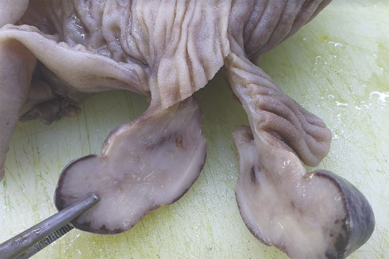 Cette femme de 19 ans consultait pour des douleurs abdominales diffuses et des vomissements post-prandiaux tardifs. Elle signalait des douleurs récurrentes et un arrêt des matières et des gaz. À l’examen, l’abdomen était distendu, avec un tympanisme à la percussion signant l’occlusion intestinale. Le bilan biologique était normal. L’échographie abdominale montrait une image d’invagination grêlo-grélique au niveau du pelvis. La tomodensitométrie confirmait l’invagination intestinale (fig. 1A ), avec à son pied une lésion ovalaire, bien limitée, hypodense, rehaussée faiblement et en périphérie après contraste (fig. 1B ). L’exploration chirurgicale trouvait une invagination iléo-iléale secondaire à une formation polyploïde intraluminale sessile ; l’anse invaginée était réséquée et la continuité rétablie par une anastomose grêlo-grélique termino-terminale. La pièce de résection de 21 cm renfermait un polype sessile de 40 x 20 x 20 mm avec, à l’examen histopathologique, un polype fibroïde inflammatoire (fig. 2 ). Les suites postopératoires étaient simples sur un recul de 3 mois.