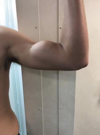 À l’examen, la flexion du coude fait saillir une tuméfaction au tiers moyen du bras gauche, sans perte de force musculaire ni déficit sensitif.