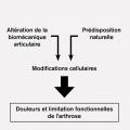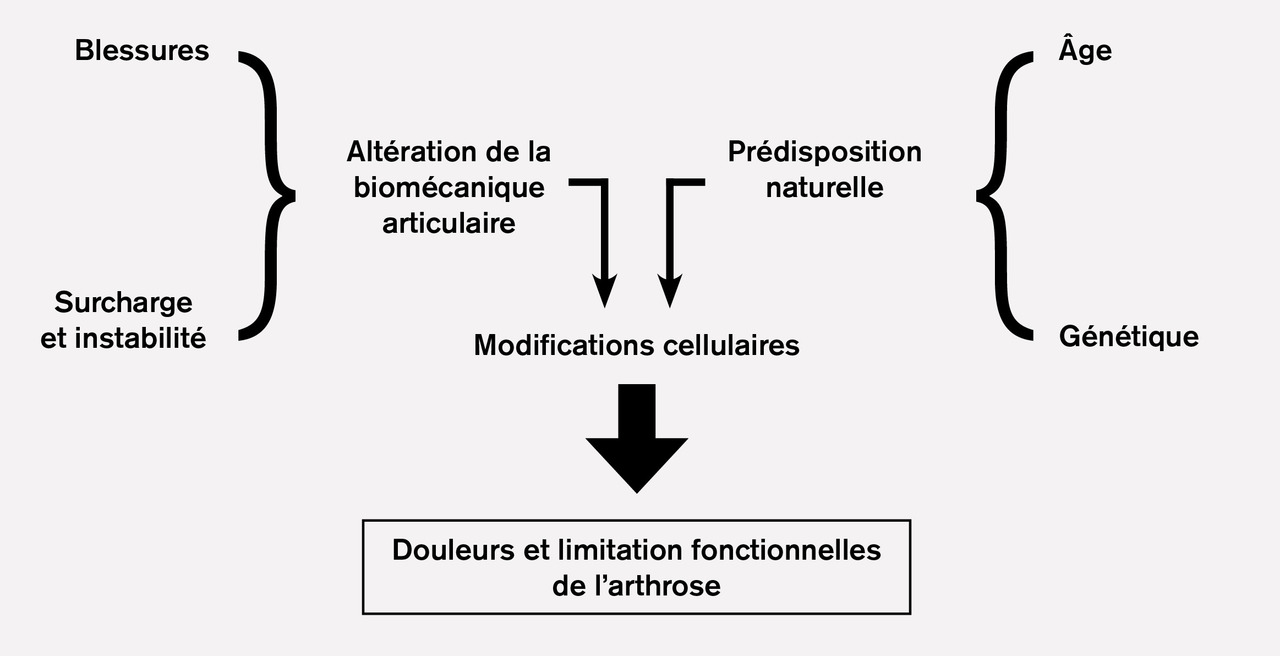 L’âge est donc un facteur de risque de l’arthrose parmi d’autres et n’est pas nécessaire et/ou suffisant à lui seul pour induire une arthrose. Ainsi, l’arthrose n’est pas exclusivement réservée aux sujets de plus de 50 ans ! Il existe plusieurs autres facteurs qui prédisposent à l’arthrose, comme la génétique, l’obésité, les lésions articulaires, les activités professionnelles ou de loisirs (v. figure ). Les mécanismes physiopathogéniques au cours de l’arthrose aboutissant à la dégradation du cartilage et des tissus articulaires débutent bien avant l’apparition des symptômes cliniques et/ou radiographiques. Il est établi depuis longtemps que des changements radiologiques dus à l’arthrose sont déjà présents chez 10 à 20 % des sujets de moins de 40 ans.3