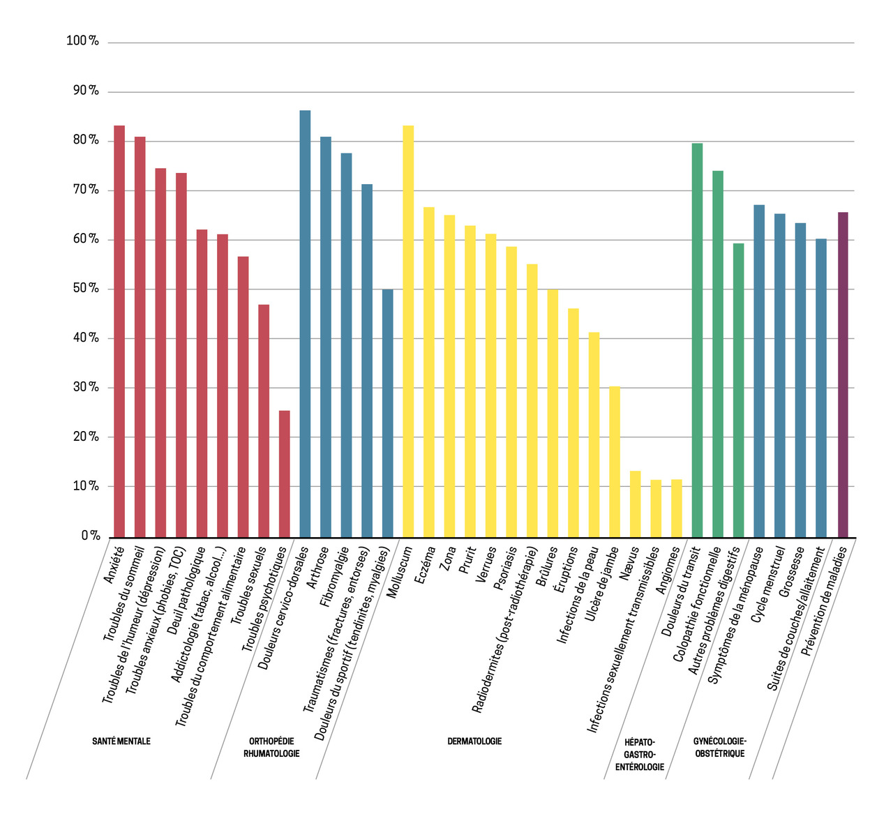 Les MAC se focalisent souvent sur les maladies chroniques – pour lesquelles les patients sont, à un moment de leur vie, lassés des interventions médicamenteuses et en quête d’autres moyens – et sur les affections à signes subjectifs (douleurs, fatigue, prurit).4,13 Dans notre étude, les disciplines de consultation les plus représentées étaient la santé mentale, la dermatologie et la rhumatologie-orthopédie. Les cinq affections les plus prises en charge par une MAC étaient les syndromes anxiodépressifs, les douleurs rachidiennes et musculotendineuses, les symptômes de la ménopause, les colopathies fonctionnelles et l’eczéma (figure).