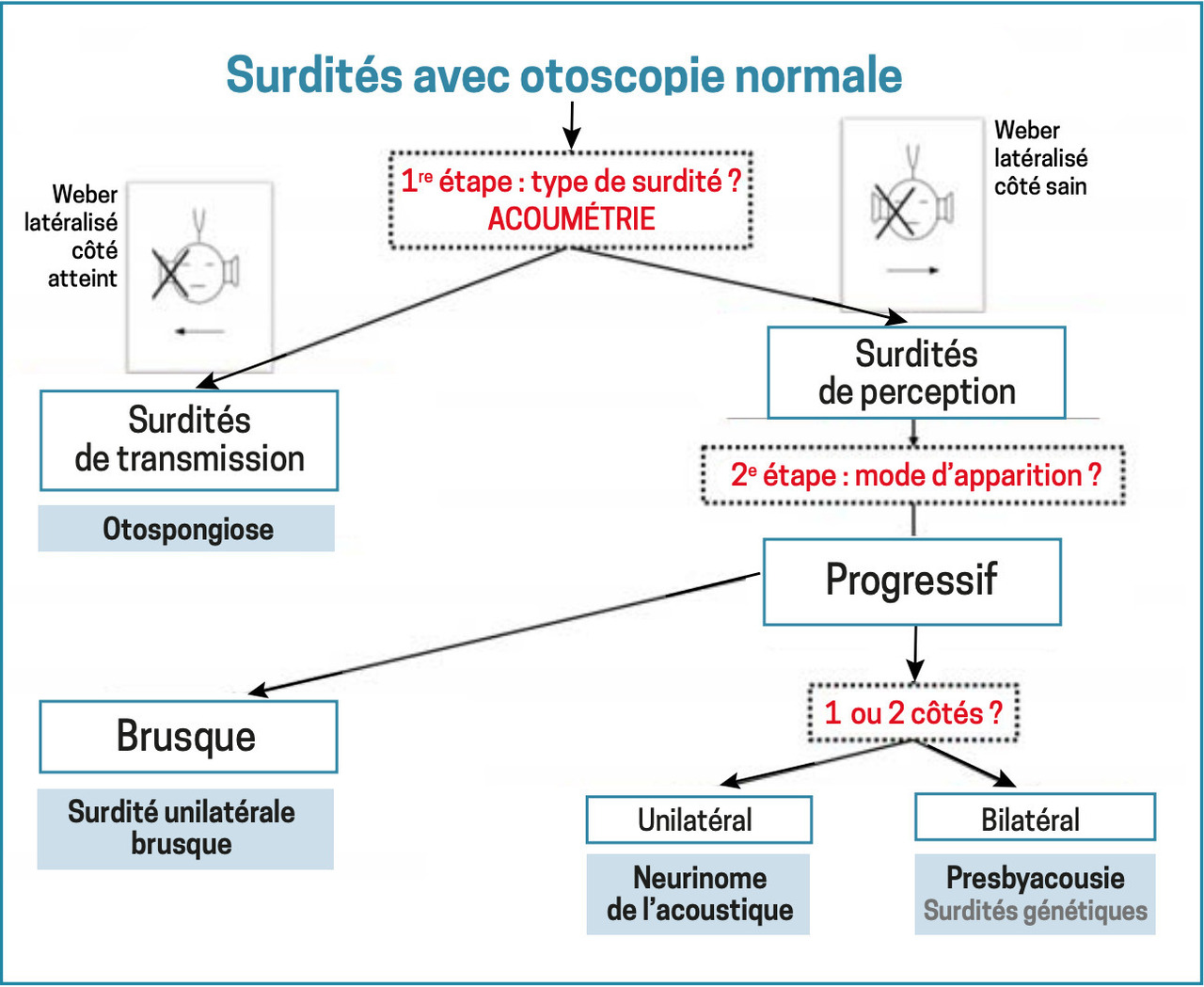 – surdité unilatérale brusque de perception : une corticothérapie orale peut être initiée par le médecin traitant ; une consultation chez l’ORL est souhaitable dans les jours qui suivent afin de réaliser une audiométrie pour quantifier la perte et envisager des mesures complémentaires (hémodilution, oxygénothérapie hyperbare, injections transtympaniques de corticoïdes) ;