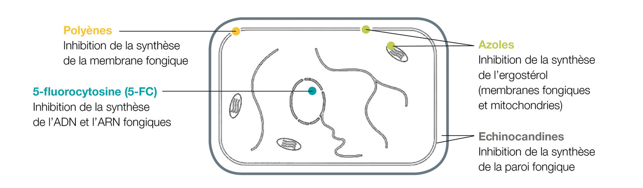 Les échinocandines : caspofungine, micafungine et anidulafungine inhibent la synthèse du bêta-(1,3)-D-glucane, constituant de la paroi fongique de la plupart des champignons (absent chez cryptocoque).