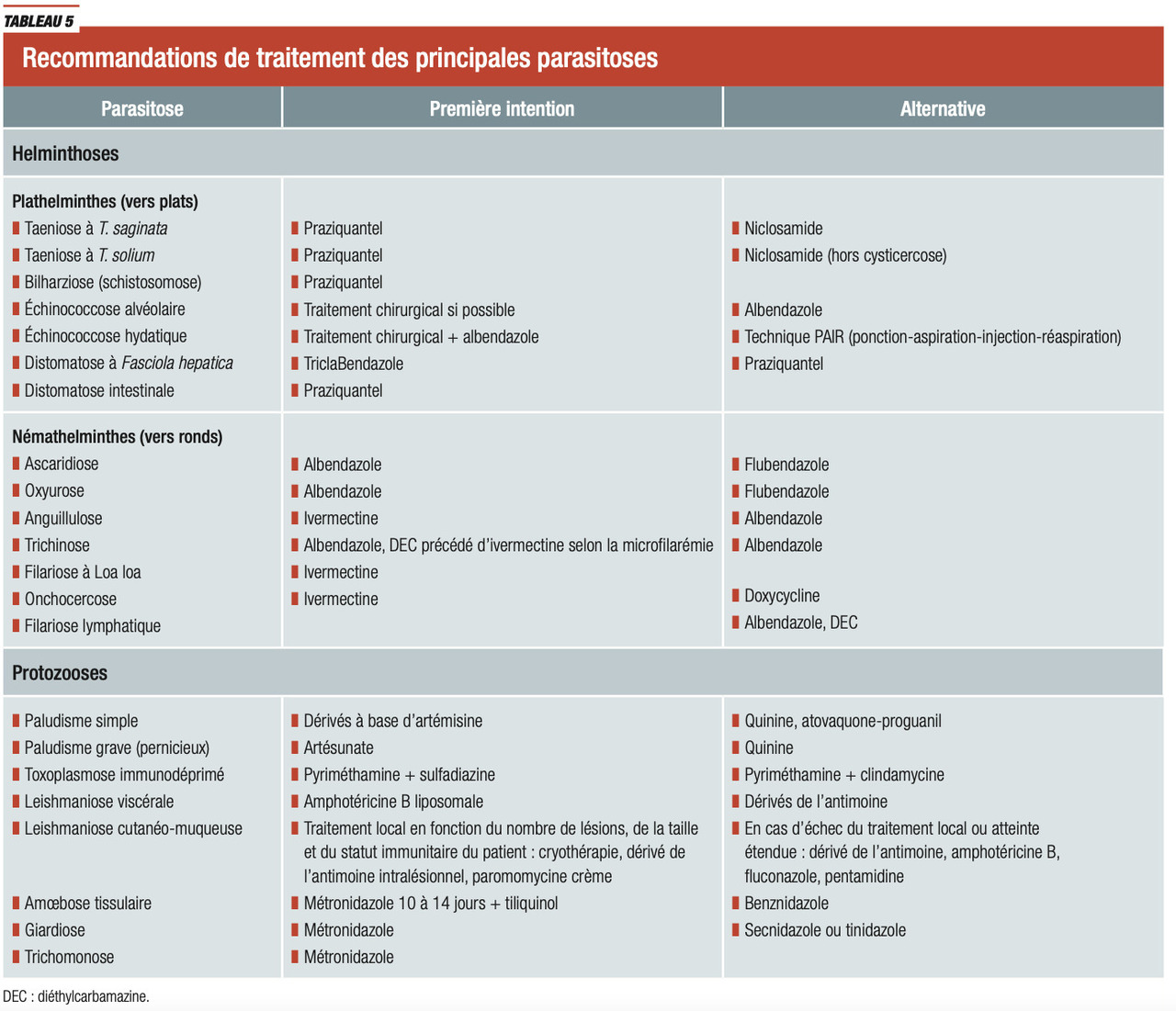 Les principaux antiparasitaires et leurs indications sont résumés dans les