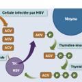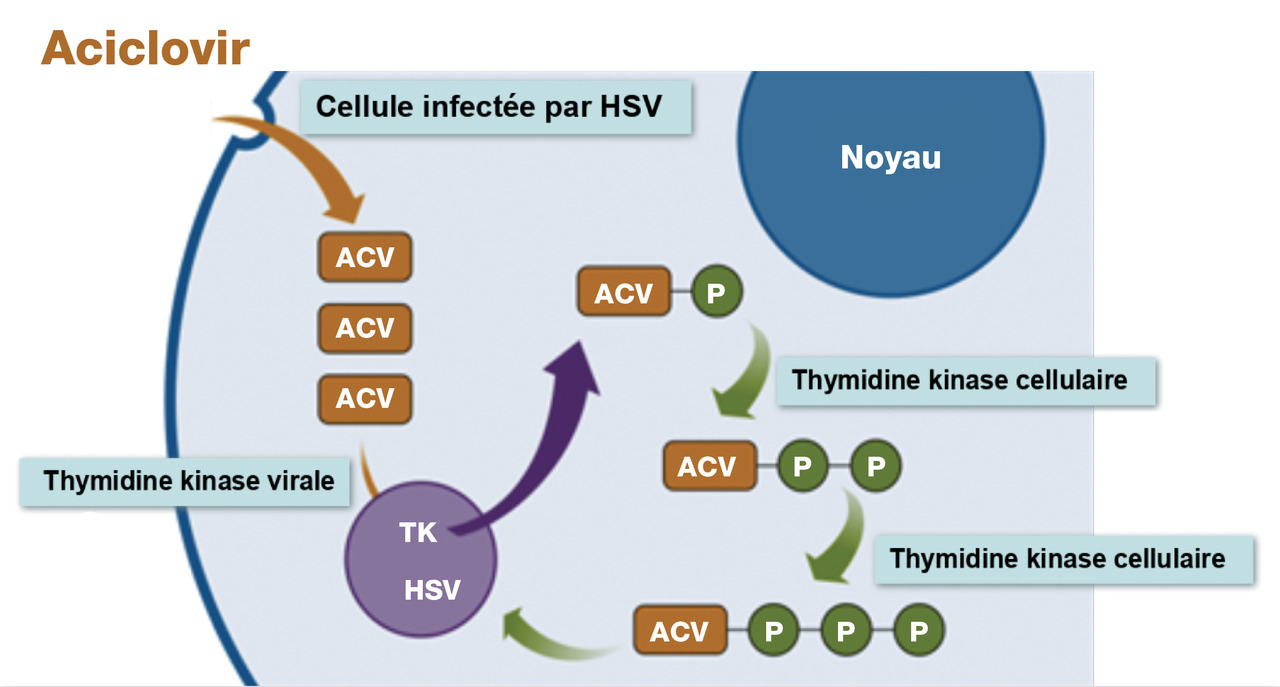 ° l’aciclovir nécessite une triple phosphorylation pour être actif, la première étant réalisée par la thymidine kinase virale, les deux suivantes par des enzymes cellulaires (