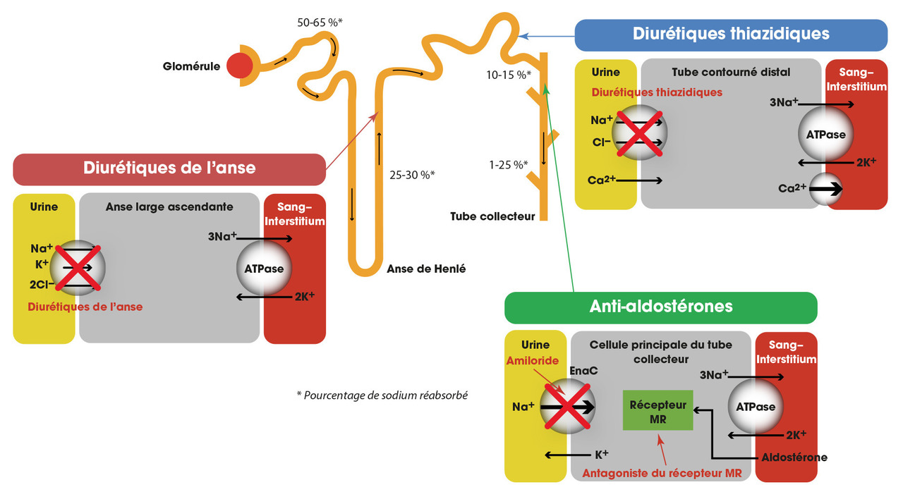 Les diurétiques augmentent l’excrétion urinaire de sodium par inhibition de sa réabsorption tubulaire.
