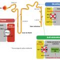 Afin de bien comprendre l’action des diurétiques, il est important de retenir que les médicaments qui agissent en distalité ne peuvent exercer leur action que sur la fraction de sodium qui n’a pas encore été réabsorbée. De plus, la physiologie des segments d’aval du néphron est modifiée par les événements se déroulant en amont. Ainsi, l’inhibition des processus de réabsorption sodée sur les segments d’amont s’accompagne d’une augmentation compensatrice de la réabsorption sodée par les systèmes en aval et modifie ainsi également l’excrétion urinaire d’autres ions dont les processus de réabsorption ou de sécrétion sont couplés à celui du sodium. En particulier, l’augmentation de la quantité de sodium arrivant dans le tube contourné distal potentialise sa réabsorption par le canal sodium épithélial ENaC et favorise l’excrétion urinaire du potassium en augmentant le gradient électrochimique transépithélial. De plus, l’activation à ce niveau de l’échangeur Na+/H+ s’accompagne d’une augmentation de l’excrétion urinaire des protons (ions H+).