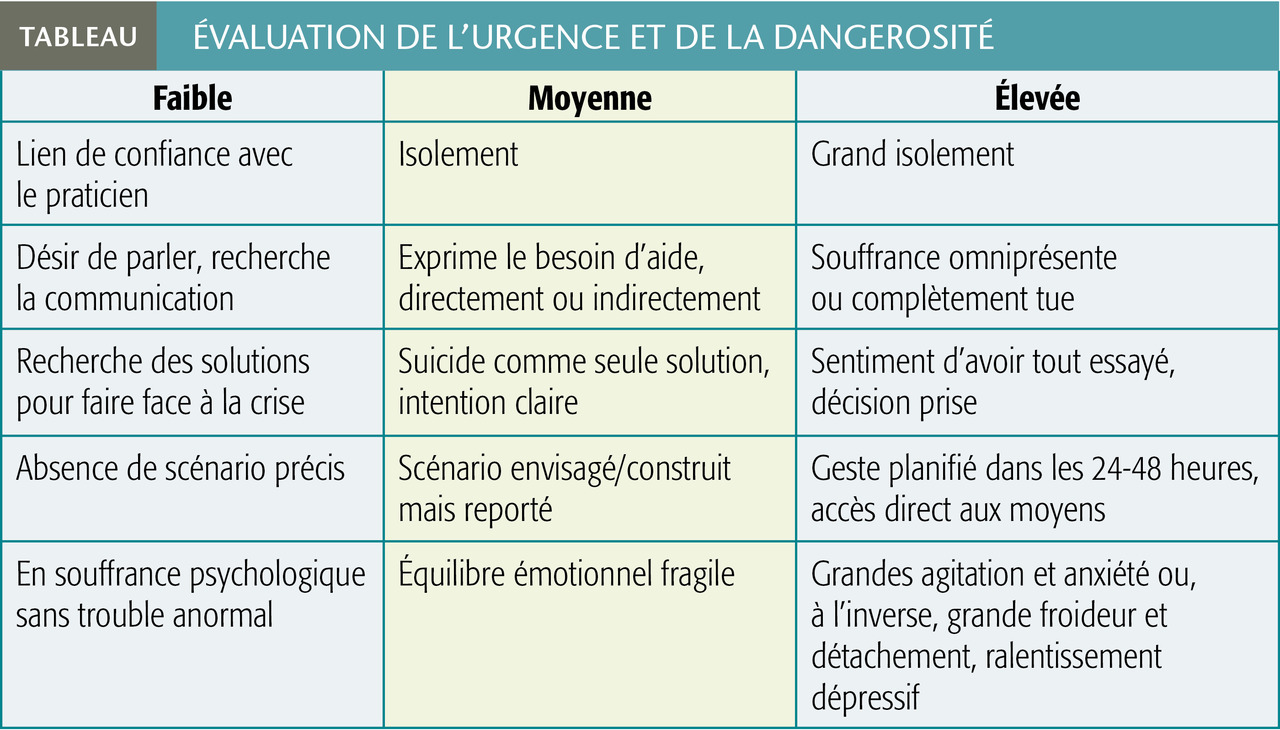Degré d’urgence (tableau). Parallèlement aux facteurs précipitants, le niveau de gravité (scénario suicidaire et délai d’action) et de danger (létalité et accessibilité du moyen envisagé) doivent être évalués pour mieux définir la stratégie à court terme.