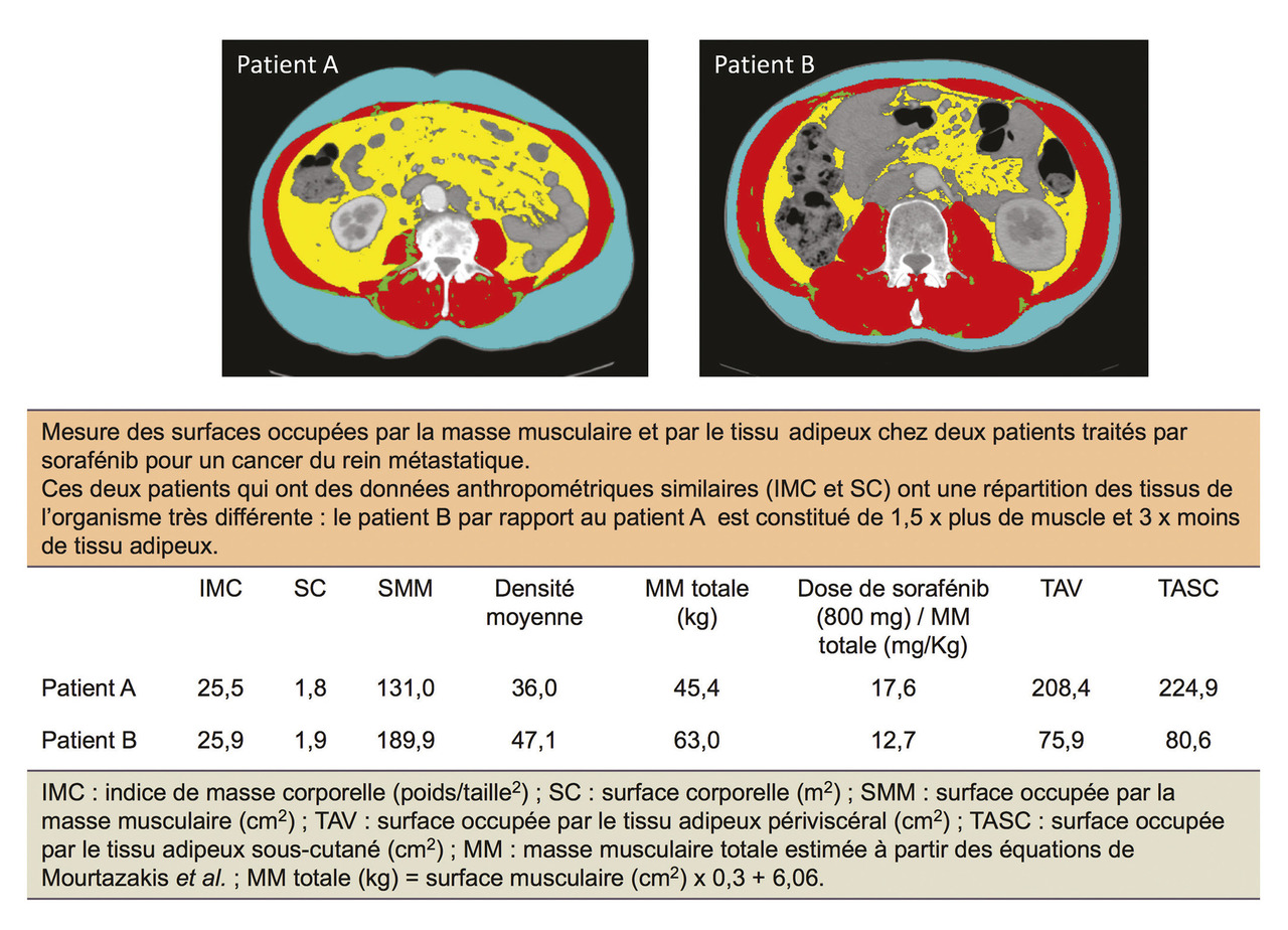 Le poids et la perte de poids ne constituent plus les pierres angulaires de la réflexion sur la nutrition en oncologie depuis que les travaux de l’équipe d’Edmonton ont montré un lien entre la déplétion de masse musculaire ou sarcopénie et le pronostic, et entre la sarcopénie et la toxicité des chimiothérapies.1 Désormais, ce qui compte ce n’est plus le gain ou la perte de poids mais les changements qui vont concerner la masse musculaire. L’utilisation de logiciels informatiques a permis l’analyse de la composition corporelle à partir d’images de tomodensitométrie. Ces techniques ont permis de montrer que deux patients ayant des paramètres anthropométriques (poids, indice de masse corporelle [IMC]) similaires peuvent avoir une grande variabilité dans la répartition des deux principaux tissus de l’organisme que sont la masse musculaire et le tissu adipeux (v. figure 2). Ayant des masses musculaires différentes (réservoirs d’acides aminés qui entrent dans la synthèse des défenses de l’organisme), ces patients ont des pronostics différents. Par ailleurs, ils vont recevoir des posologies de chimiothérapie différentes quand celles-ci sont rapportées à la masse musculaire et peuvent donc présenter une fréquence de toxicité plus importante.