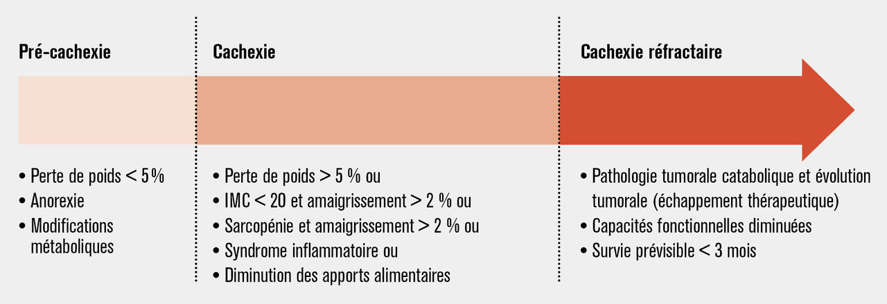 La cachexie cancéreuse est un continuum de différents stades avec les notions de pré-cachexie et de cachexie réfractaire (v. figure 1).