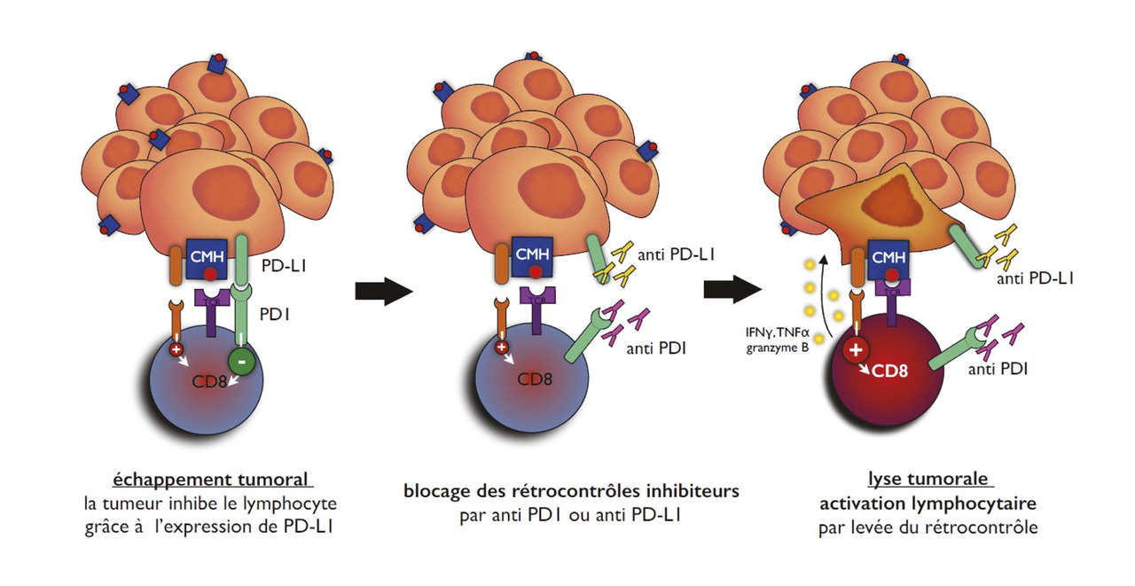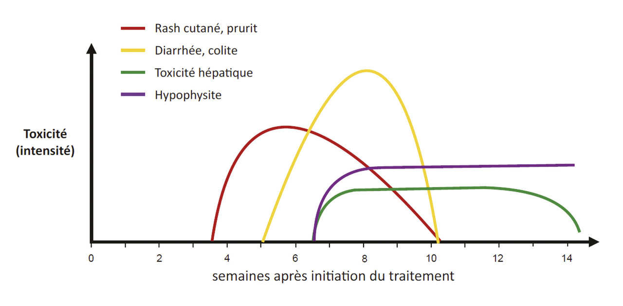 Sous anti-PD1, les effets indésirables sont moins fréquents et moins sévères (10 % de toxicité grade > 3) et surviennent en moyenne dans les 6 premiers mois suivant l’initiation du traitement.