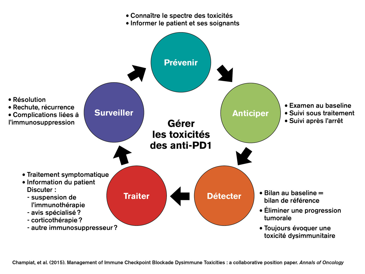 Les grands principes de la prise en charge des toxicités liées aux immunothérapies reposent sur cinq piliers proposés en 2015 à l’institut Gustave-Roussy : prévenir, anticiper, détecter, traiter, surveiller.6