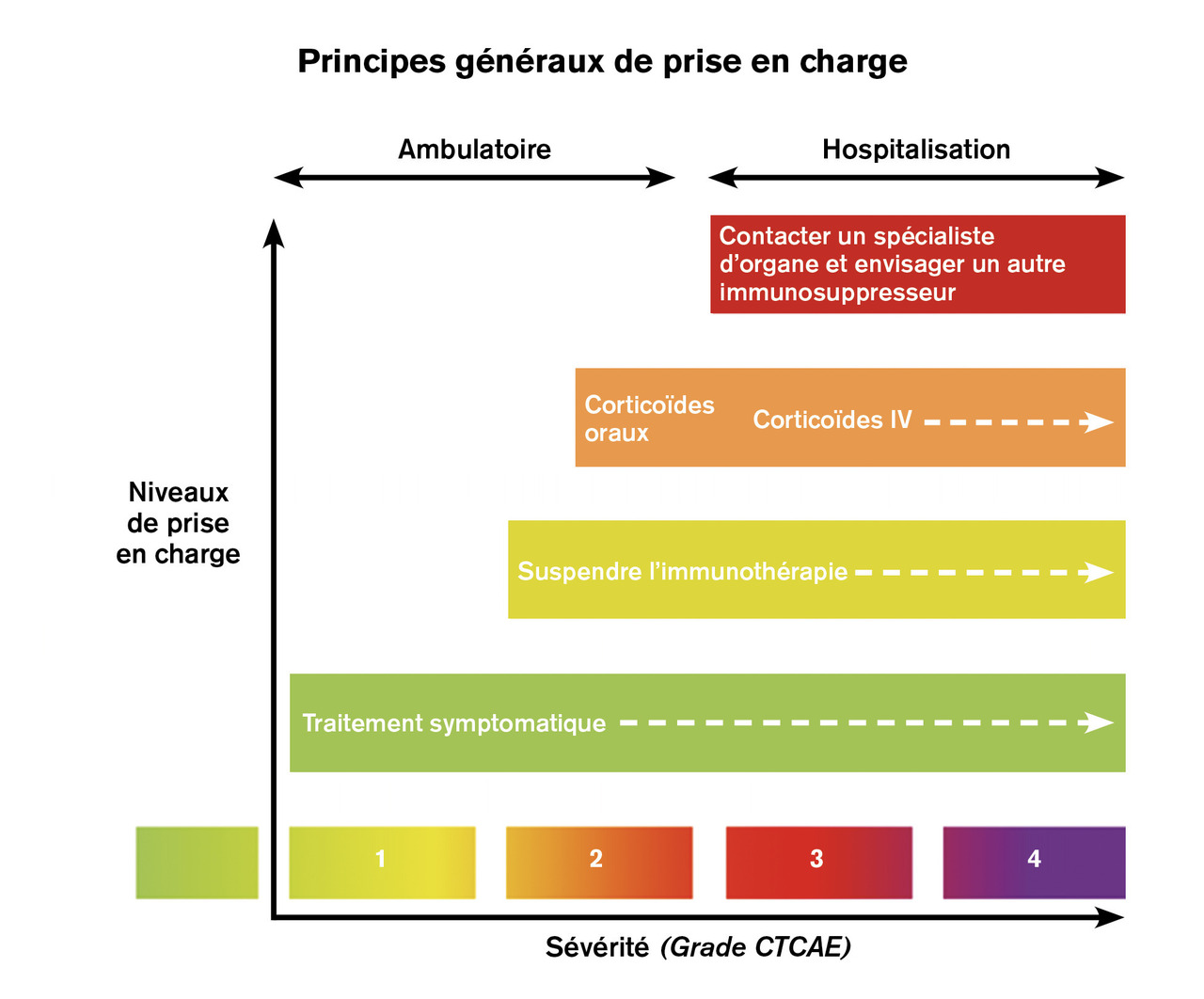 En cas de difficultés diagnostiques, la suspension de l’immunothérapie doit être privilégiée afin de ne pas risquer d’aggraver un potentiel effet indésirable. En dehors des toxicités endocriniennes contrôlées par un traitement substitutif, la plupart des toxicités liées à l’immunothérapie nécessitent une suspension au moins temporaire de l’immunothérapie jusqu’à ce que la toxicité disparaisse. Dans le cas de toxicités sévères (grade 3 ou 4) ou modérées mais non résolutives malgré un traitement adapté, il est recommandé d’arrêter définitivement l’immunothérapie concernée.