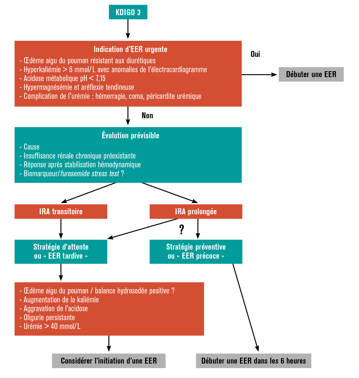 Les études observationnelles ont permis de mettre en évidence une relation entre la mortalité et l’existence d’une balance hydrique positive. Chez les patients ayant une insuffisance rénale aiguë, une balance hydrosodée positive pourrait être un argument d’initiation de l’épuration extrarénale.6 Cependant, les effets d’une telle stratégie n’ont pas encore été suffisamment évalués. Un algorithme précisant les indications d’initiation d’une épuration extrarénale est proposé à la figure ci-contre.En conclusion, une épuration extrarénale doit être débutée au plus vite en cas de complication de l’insuffisance rénale aiguë mettant en jeu le pronostic du patient. Dans les autres cas, les données de la littérature sont discordantes en raison de l’hétérogénéité des études. La prise en compte de l’évolution attendue de la fonction rénale à court terme est probablement intéressante pour prendre la décision de débuter une épuration extrarénale, mais reste à démontrer.
