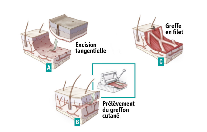 Sauf exception, le principe de l’excision-greffe précoce des brûlures profondes prévaut, conditionnée par la surface corporelle brûlée et par la disponibilité en sites non brûlés donneurs de peau saine. L’excision-greffe précoce a démontré son efficacité sur la survie, la limitation du risque infectieux, la réduction des pertes sanguines et la réduction de la durée d’hospitalisation.
