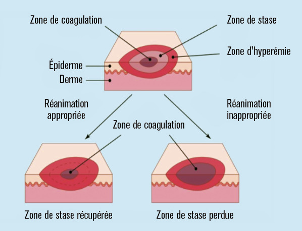 Le potentiel d’auto-aggravation signe les brûlures graves. Localement, les brûlures présentent typiquement des zones concentriques1 de nécrose par coagulation, de stase ischémique, et d’hyperémie inflammatoire (fig. 1). Outre l’effraction de la barrière cutanée, la toxicité des nécroses entraîne une inflammation qui s’exporte en un syndrome de réponse inflammatoire systémique majeur, prolongé et dépendant de la dose de brûlure. Il en résulte une maladie générale caractérisée par une plasmorragie maximale dans les premières heures et responsable d’un choc hypovolémique, par une immunodépression et par un hypercatabolisme extrême pouvant durer plusieurs mois. Cumulé au risque infectieux sévère, l’ensemble expose aux défaillances d’organes et à l’approfondissement des lésions locales. Les enjeux principaux de la prise en charge sont donc, d’une part, de prévenir et de traiter les défaillances d’organes et les complications infectieuses et, d’autre part, d’éliminer les nécroses et de restituer une barrière cutanée intègre au plus tôt.