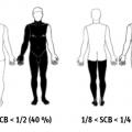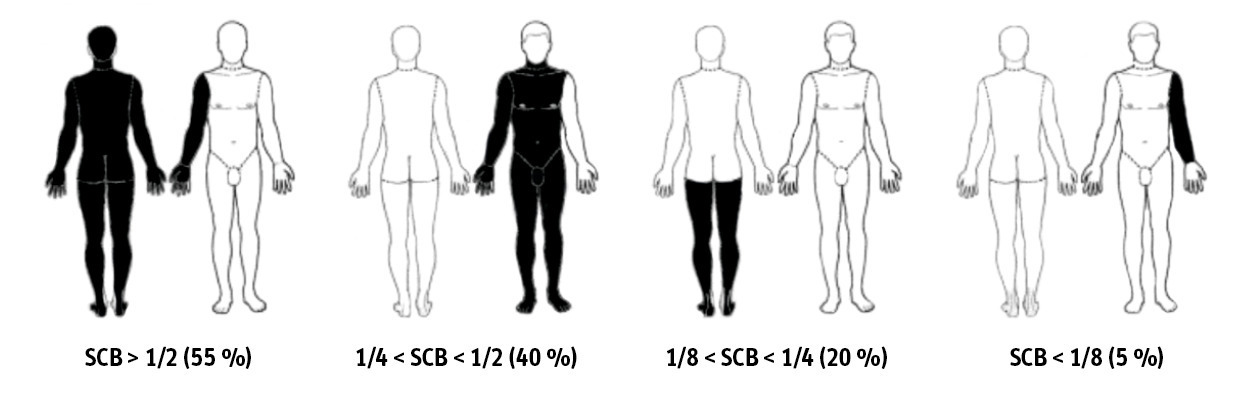 Les objectifs centraux de la prise en charge préhospitalière sont l’évaluation correcte de la gravité des brûlures, pour permettre une orientation optimale, et la mise en sécurité du patient. Celle-ci repose sur la sécurisation des voies aériennes, un abord vasculaire fiable, le début de la réanimation hydroélectrolytique, l’analgésie, voire la sédation, et la prévention de l’hypothermie, avec un emballage sec au moins isotherme des brûlures. Les principes sont les mêmes que pour la prise en charge hospitalière initiale, mais on utilise ici un outil simplifié pour estimer la surface cutanée brûlée, la série des moitiés :2 la surface du corps est divisée par moitiés successives, face avant-face arrière 1/2, soit 50 % chacune ; pour chaque face, haut-bas 1/4, soit 25 % chacune ; enfin, dernière subdivision gauche-droite 1/8, soit 10 à 15 % chacune (fig. 2 ).
