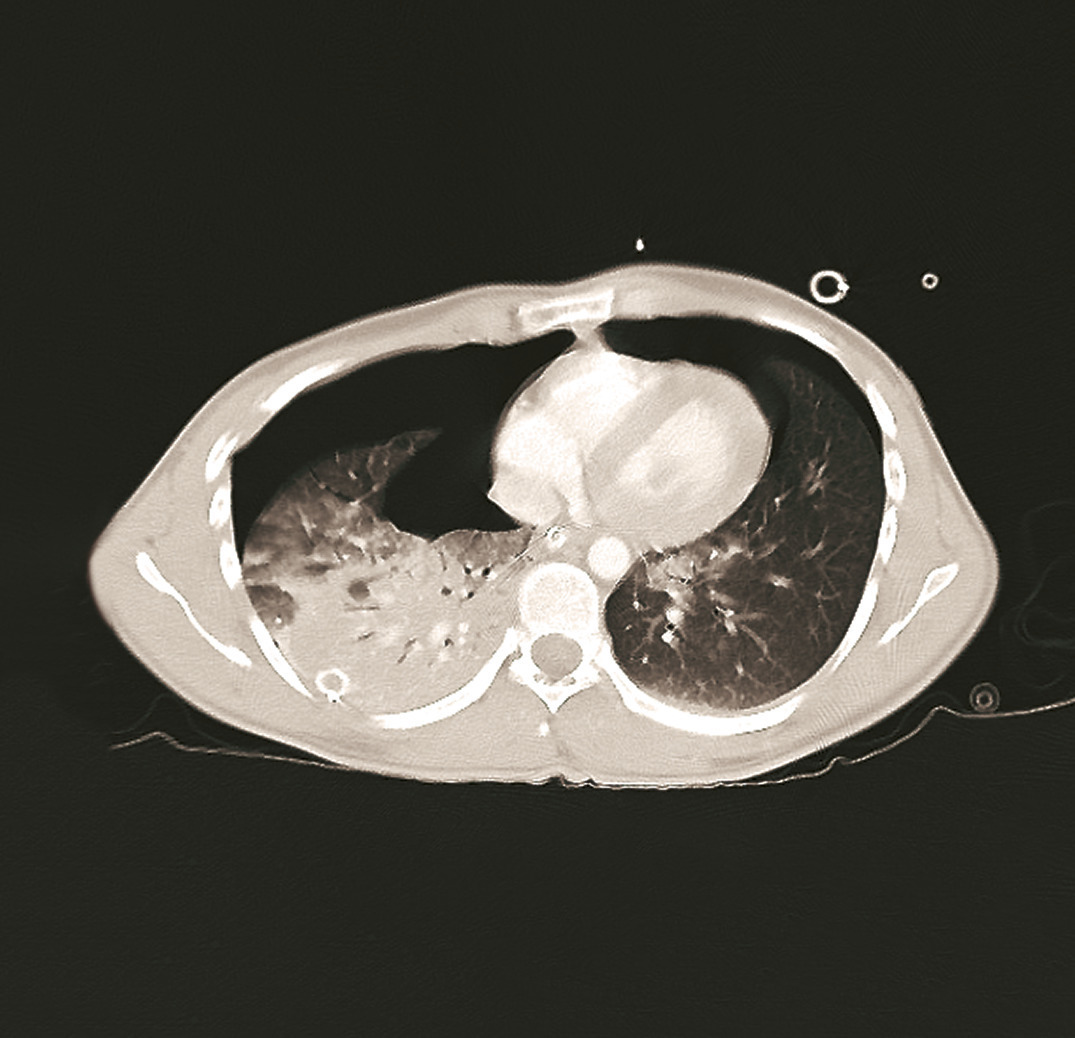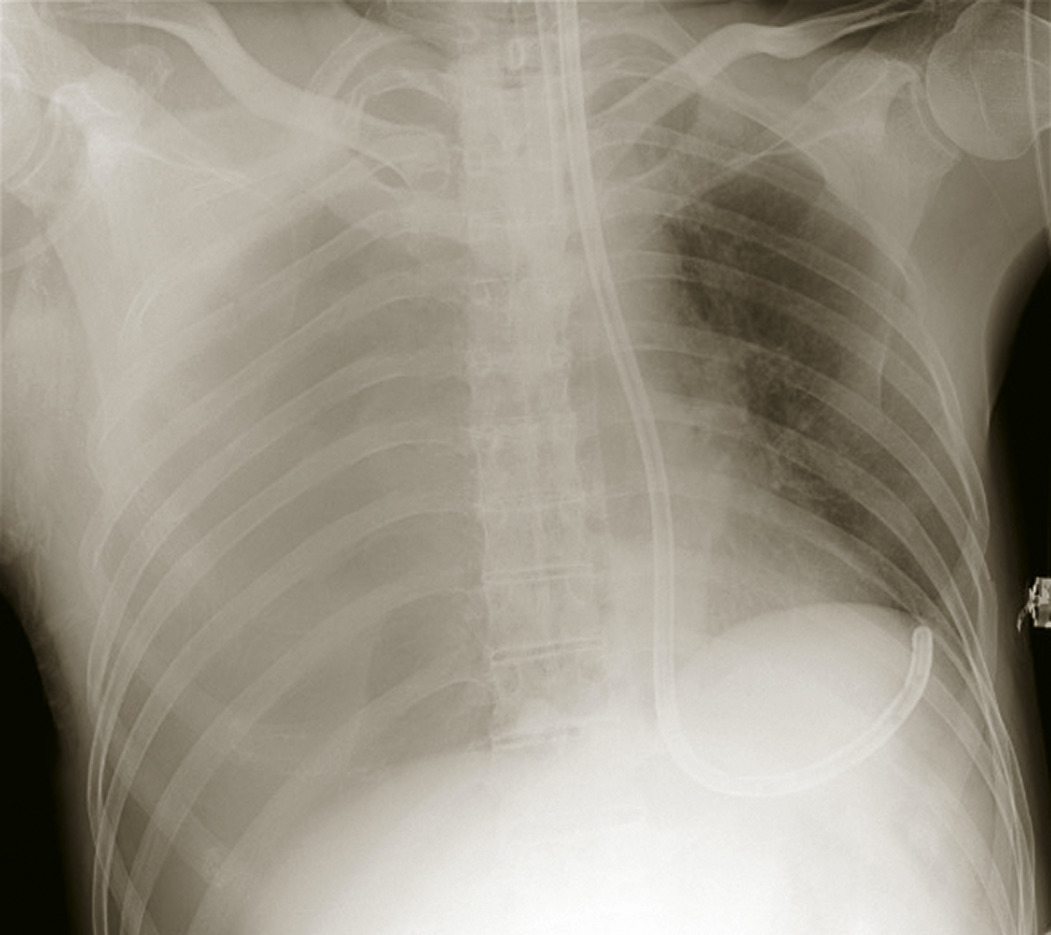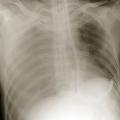 - une radiographie thoracique de face (fig. 2) pour confirmer un pneumothorax compressif ;