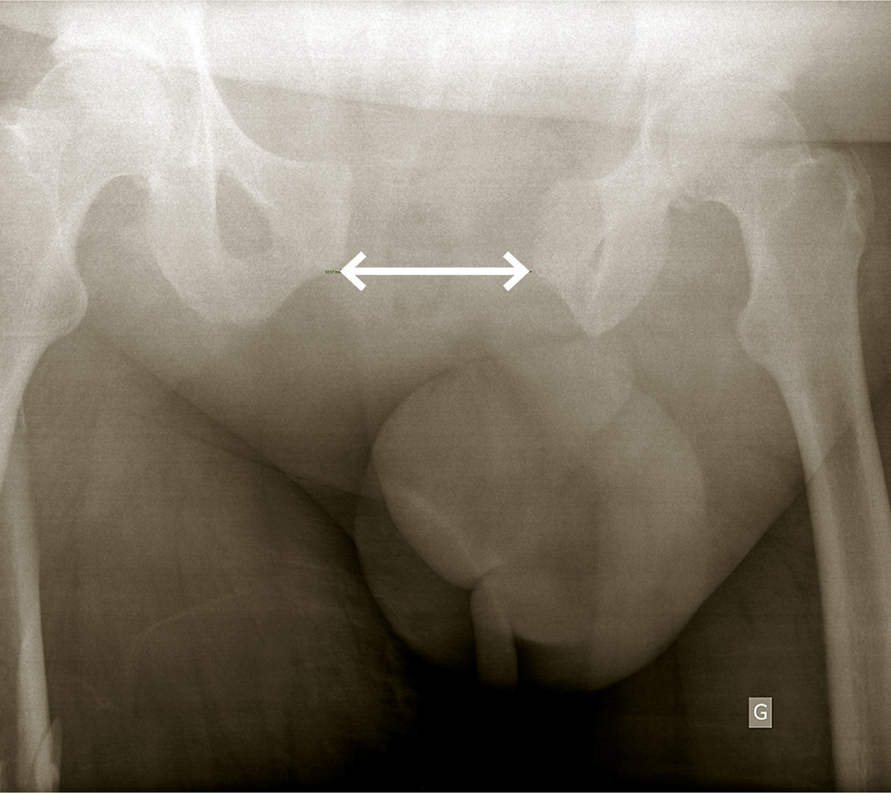 - une radiographie du bassin de face (fig. 3), à la recherche d’un fracas de l’anneau pelvien ; en l’absence d’autre cause évidente de défaillance circulatoire, elle oriente vers une hémorragie pelvienne et rétropéritonéale.