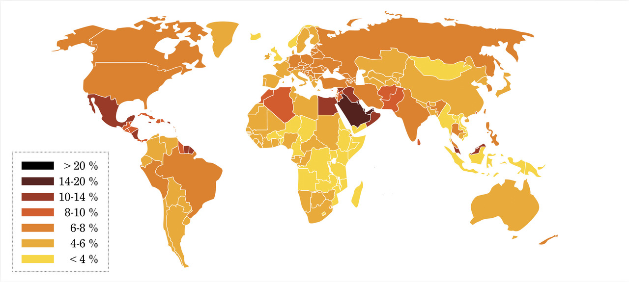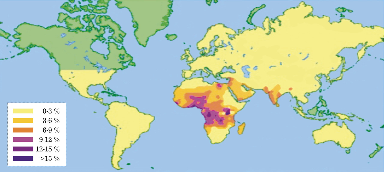 Au-delà des migrants primo-arrivants en situation de grande précarité et même s’il est difficile de résumer les immigrés à une population homogène, on constate qu’une partie d’entre eux est plus exposée à un certain nombre de problèmes de santé comme la souffrance psychique, les maladies chroniques, une mauvaise santé maternelle et infantile, une mauvaise santé au travail et certaines maladies infectieuses et tropicales.6, 7 Plusieurs travaux font état de prévalence élevée de maladies chroniques (diabète, hypertension artérielle, maladies cardiovasculaires, insuffisance rénale, obésité) parmi les populations immigrées en lien avec la transition sanitaire (v. p. 550 ) [fig. 1]. Certaines maladies génétiques sont rencontrées spécifiquement parmi les populations migrantes et en particulier la drépanocytose, qui est fréquente parmi les populations d’origine africaine, antillaise ou du sous-continent indien (fig. 2).