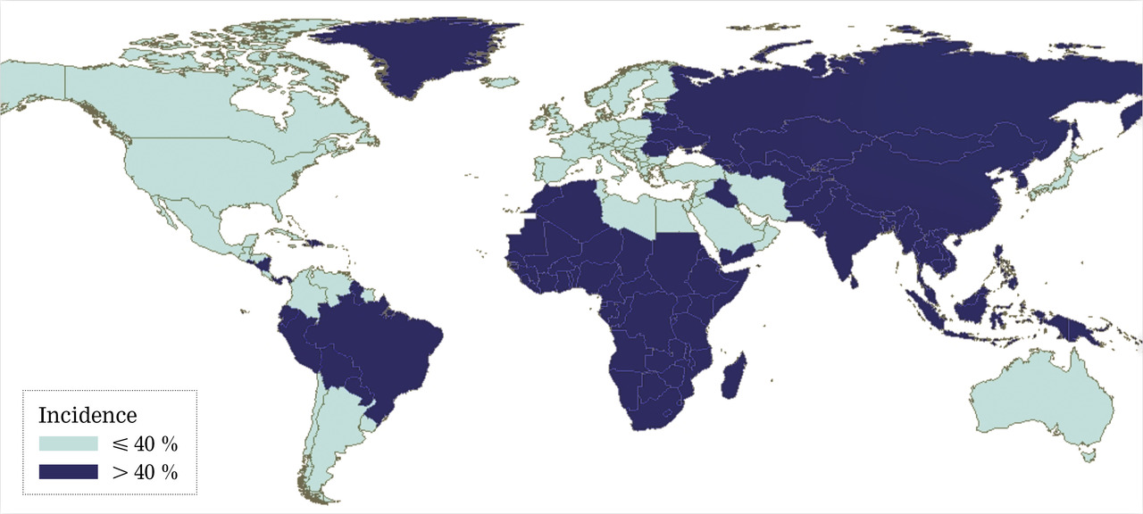 En ce qui concerne les maladies infectieuses, la tuberculose maladie est fréquente, avec une incidence qui peut être jusqu’à 8 fois plus élevée qu’en population générale pour ceux arrivés depuis moins de 2 ans, mais reste élevé jusqu’à 5 ans après l’arrivée (fig. 3). Comme c’est aussi une maladie de la précarité, l’accompagnement social doit faire partie du soin. Les immigrés d’Afrique subsaharienne représentent 80 % des cas de paludisme d’importation, en lien avec vraisemblablement une forte exposition et une insuffisance d’application des mesures prophylactiques par ceux que les chercheurs appellent les « visiting friends and relatives ». Les parasitoses digestives ne sont pas rares même si on manque de chiffres récents pour mieux en évaluer le poids résiduel, des études anciennes ayant précédé les grandes campagnes de l’Organisation mondiale de la santé (OMS) faisant état de prévalences élevées. La bilharziose semble en revanche être un problème de santé publique non négligeable parmi les migrants originaires des zones d’endémie en Afrique avec souvent des retards diagnostiques du fait de l’absence de symptômes et de l’absence de programme de dépistage généralisé (fig. 4). La maladie de Chagas n’est pas rare chez les migrants originaires des pays à risque en Amérique du Sud comme la Bolivie et ayant vécu en zone rurale dans des habitats précaires.
