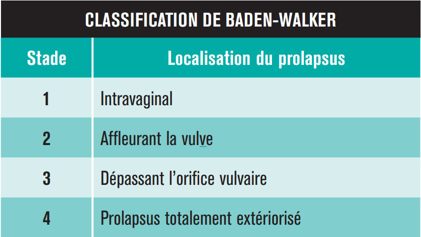 La classification du prolapsus est importante pour le suivi de la patiente. En pratique clinique courante, la classification de Baden et Walker suffit (tableau).