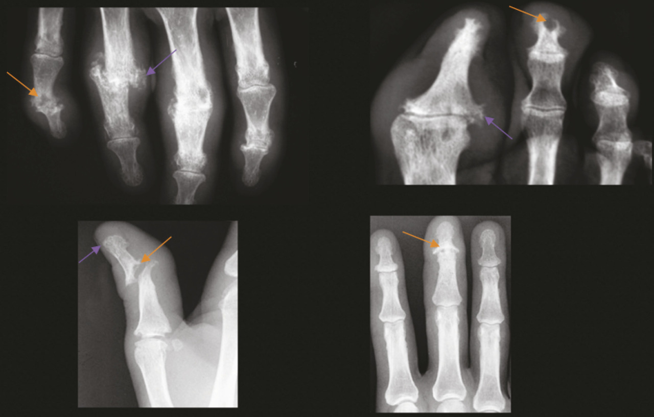 L’atteinte périphérique est également polymorphe, avec des arthralgies simples, des oligoarthrites asymétriques, des dactylites mais aussi parfois de véritables tableaux de polyarthrites érosives et mutilantes. Dans ces dernières, on observe l’association de lésions constructrices (ankylose, périostose, syndesmophytes) et de lésions destructrices (érosions, acro-ostéolyse) sur une même arti- culation ou une même région ana- tomique (main, pied) [v. figure]. Le pronostic fonctionnel dépend de l’activité de la maladie et des destructions structurales responsables du handicap.
