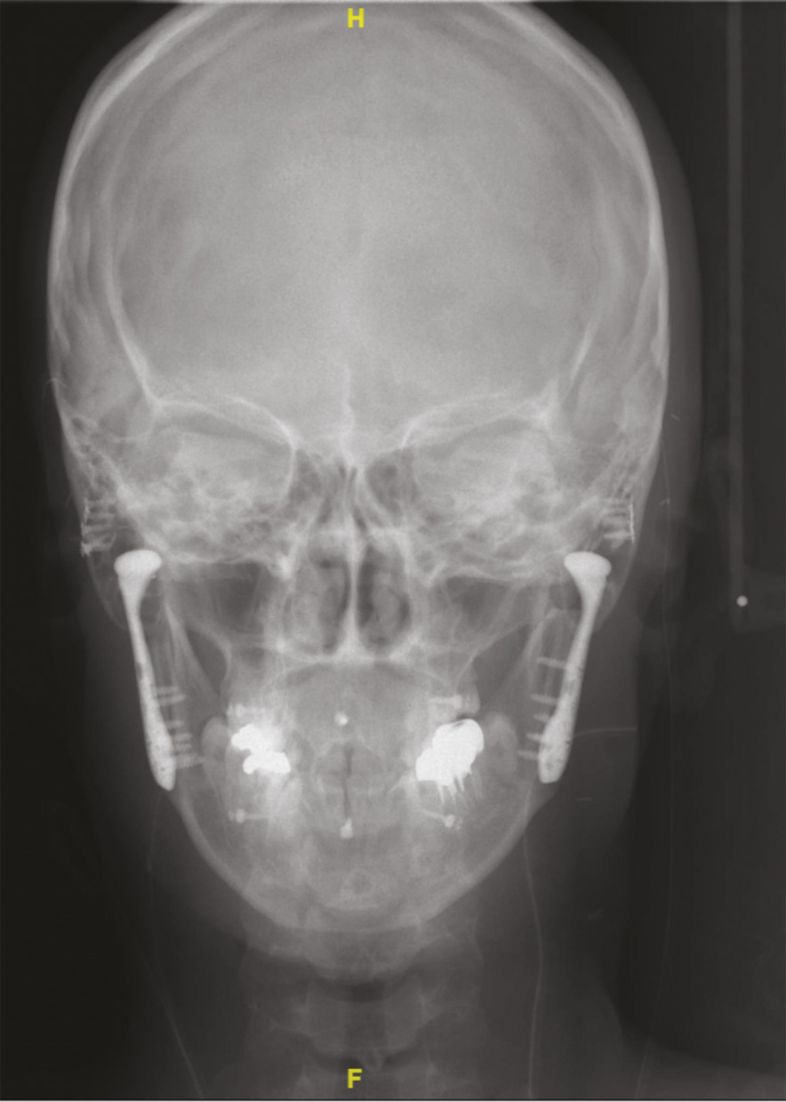 La durée d’hospitalisation varie de 2 à 5 jours et une antibiothérapie est habituellement prescrite pour une durée de 7 jours. Aucun blocage maxillo-mandibulaire n’est nécessaire en postopératoire. Une alimentation molle est recommandée pendant 1 mois (fig. 4) .