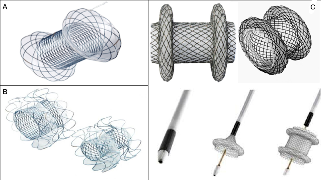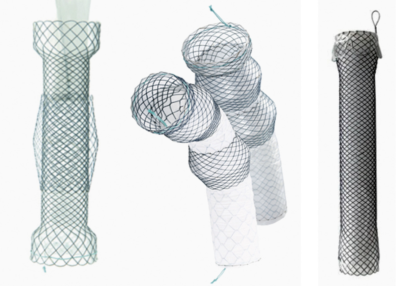 La fistule après chirurgie œsophagienne carcinologique requiert une PMC pour dériver les sécrétions et les aliments, avec un risque de migration limité. Ainsi, des prothèses adaptées (fig. 4 ) sont placées pendant 6 à 8 semaines, induisant une réépithélialisation qui referme l’orifice fistuleux. L’efficacité est de 70 %, souvent après plusieurs changements de prothèse et en moyenne 3 à 6 mois de traitement.