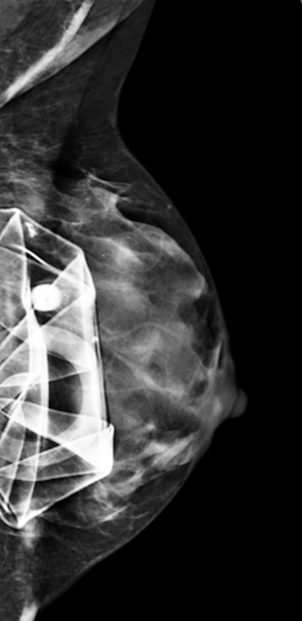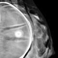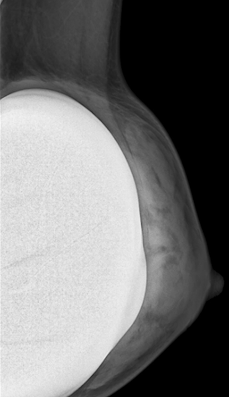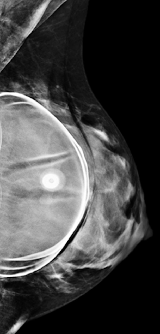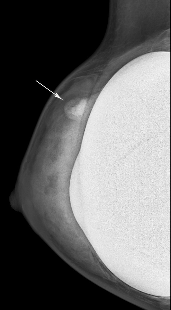En mammographie : aspect rond, régulier, hyperdense si en silicone (fig. 1), moins dense en cas de sérum physiologique (fig. 2). Confirmé par la tomosynthèse (3D), à utiliser avec parcimonie en raison de l’exposition aux rayons.