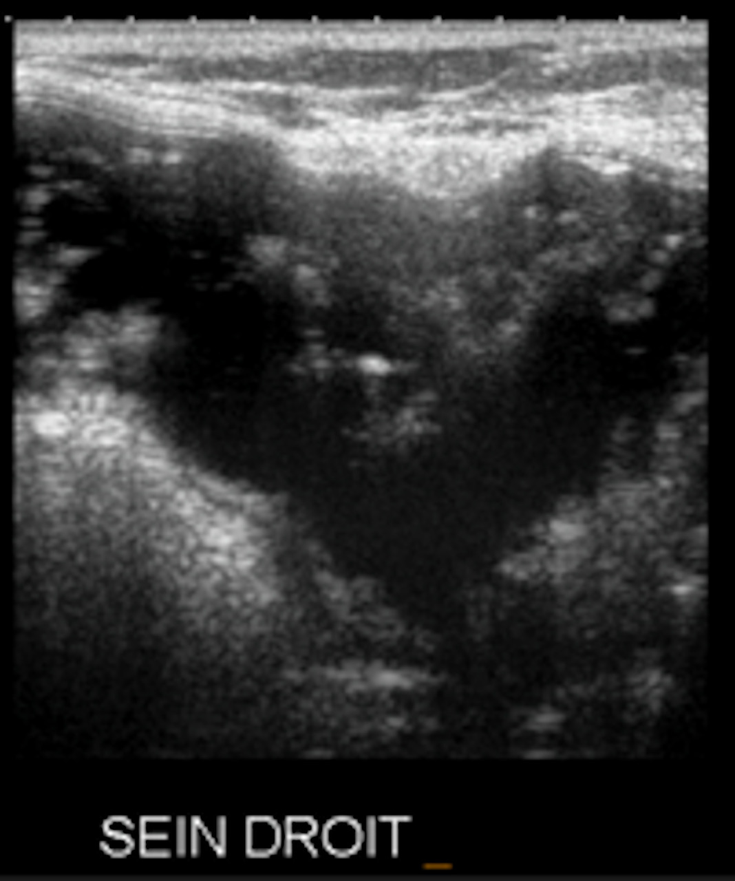 Augmentation de taille du sein, avec plainte fonctionnelle : suspecter une rupture de la prothèse ou un sérome périprothétique (lame liquidienne autour de l’implant).