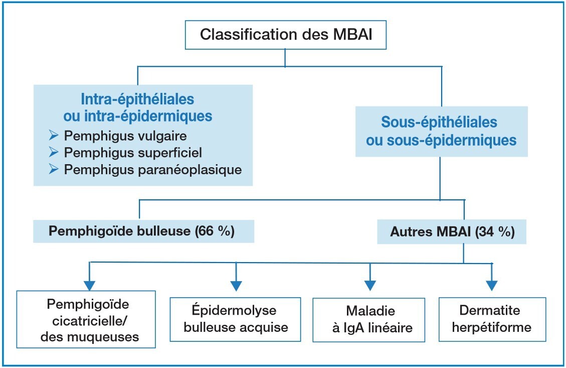 - Autres MBAI sous-épidermiques : pemphigoïde cicatricielle/pemphigoïde des muqueuses, épidermolyse bulleuse acquise, maladie à IgA linéaire…