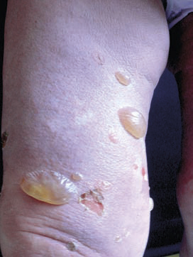 Le diagnostic de la forme typique (fig. 2) est aisé : survenue chez le sujet âgé (> 70 ans) de bulles spontanées de grande taille, tendues, sur une base érythémateuse, associées à des lésions urticariennes ou eczématiformes, siégeant de façon bilatérale et globalement symétrique sur les faces de flexion des membres, les plis inguinaux et axillaires, la partie basse de l’abdomen. L’extrémité céphalique est habituellement épargnée. Leur nombre est très variable : de moins de 10 (formes paucibulleuses) à plus de 300 (multibulleuses) ; elles laissent place, une fois rompues, à des érosions. Il faut les comptabiliser quotidiennement. Le prurit, volontiers intense, est quasi constant et précède souvent l’éruption. Les lésions guérissent sans laisser de cicatrice. L’atteinte muqueuse est rare (8 % des cas) et doit faire évoquer un diagnostic différentiel (encadré 1). L’hémogramme montre habituellement une hyperéosinophilie. Des formes atypiques sont décrites : atteintes chroniques aspécifiques eczématiformes ou urticariennes fixes pré- ou post-bulleuses : (fig. 3), tableau de prurigo chez un sujet âgé (fig. 4), prurit sine materia.