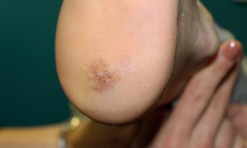 Jean, 67 ans, a depuis 15 jours une lésion non douloureuse au niveau du talon. Noire au début, elle est devenue progressivement plus claire. Ce patient est très sportif (marche en terrain escarpé).