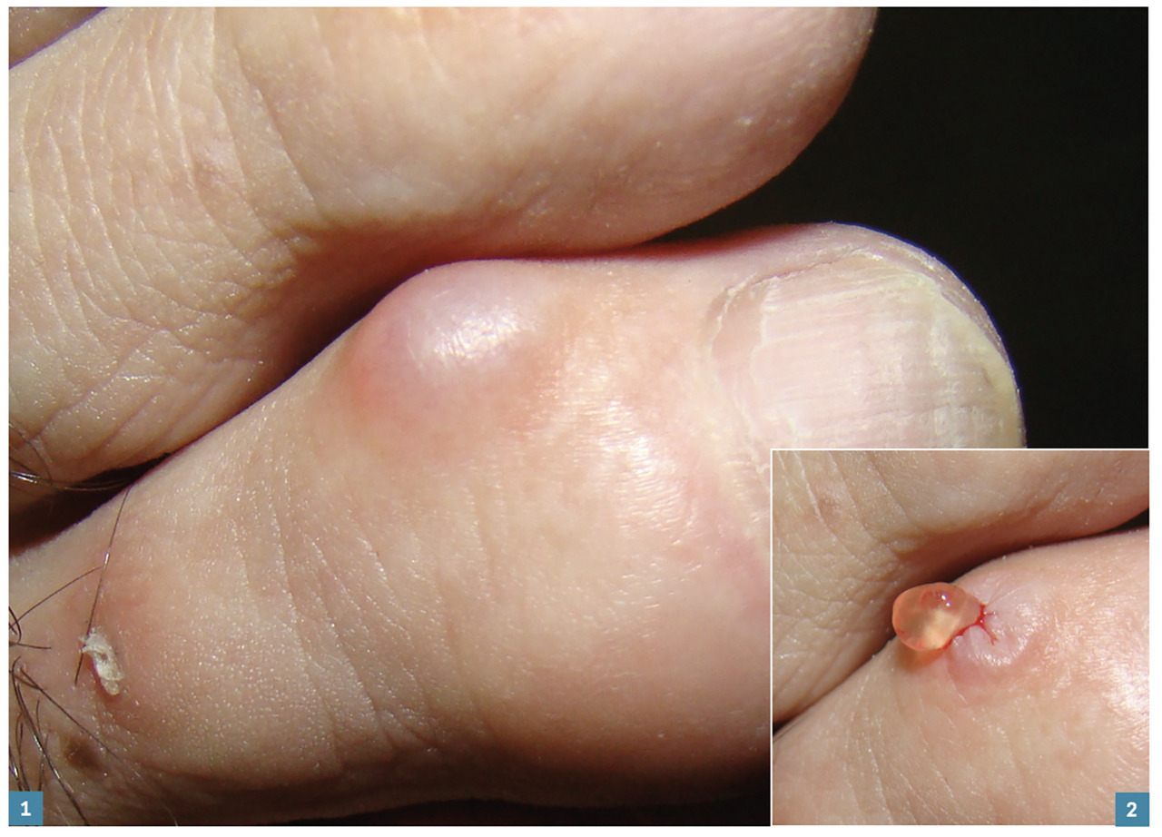 Michel, 62 ans, consulte après l’apparition il y a 1 semaine d’une formation translucide sur le bord d’un orteil (fig. 1 ). Il craint une évolution péjorative. Après manipulation et exérèse, une pâte visqueuse est exprimée (fig. 2 ).