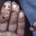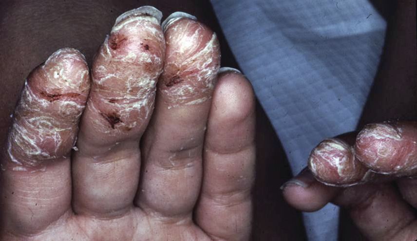 Le psoriasis pustuleux peut être soit localisé (formes palmo-plantaires et acrodermatite continue de Hallopeau, qui affecte les extrémités des doigts et/ou des orteils avec une onychopathie ; fig. 10 ), soit généralisé (de von Zumbusch ; fig. 11 ), caractérisé par l’apparition brutale de patchs érythémateux disséminés avec des pustules stériles qui deviennent coalescentes et une altération de l’état général plus ou moins fébrile.