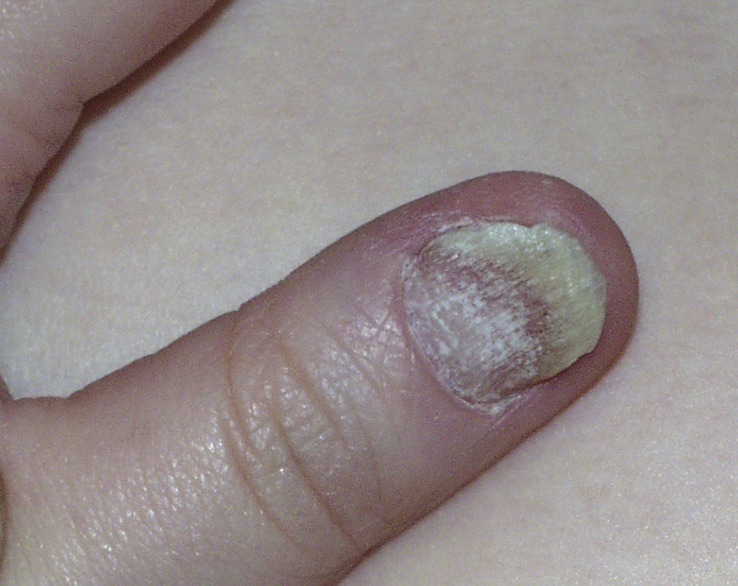 L’atteinte unguéale touche 50 % des patients (et jusqu’à 90 % de ceux ayant une arthrite psoriasique). Elle se caractérise par des dépressions ponctuées en « dé à coudre », des taches saumonées sous la tablette unguéale, une hyperkératose sous-unguéale, une onycholyse distale et, à un stade tardif, par une dystrophie totale (fig. 8 ).