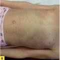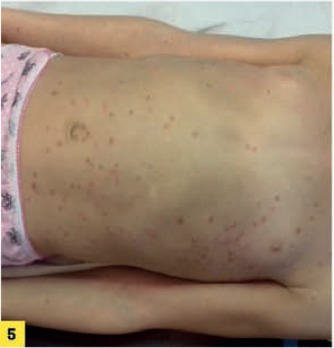 Le psoriasis en gouttes survient essentiellement chez les enfants et les adultes jeunes, généralement à la suite d’une infection streptococcique. Il se manifeste par de petites plaques (< 1 cm), moins épaisses et moins desquamatives que dans la forme classique. Elles siègent essentiellement sur le tronc et la racine des membres ; pas d’atteinte palmo-plantaire, ni unguéale ni du cuir chevelu (fig. 5 ).
