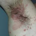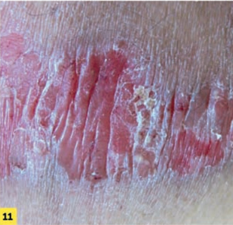 Le type inversé se caractérise par des lésions érythémateuses des plis à limites nettes, souvent dépourvues de squames en raison des frottements et de l’humidité. Localisations les plus évocatrices : plis ombilicaux, interfessier, sous-mammaires, axillaires (