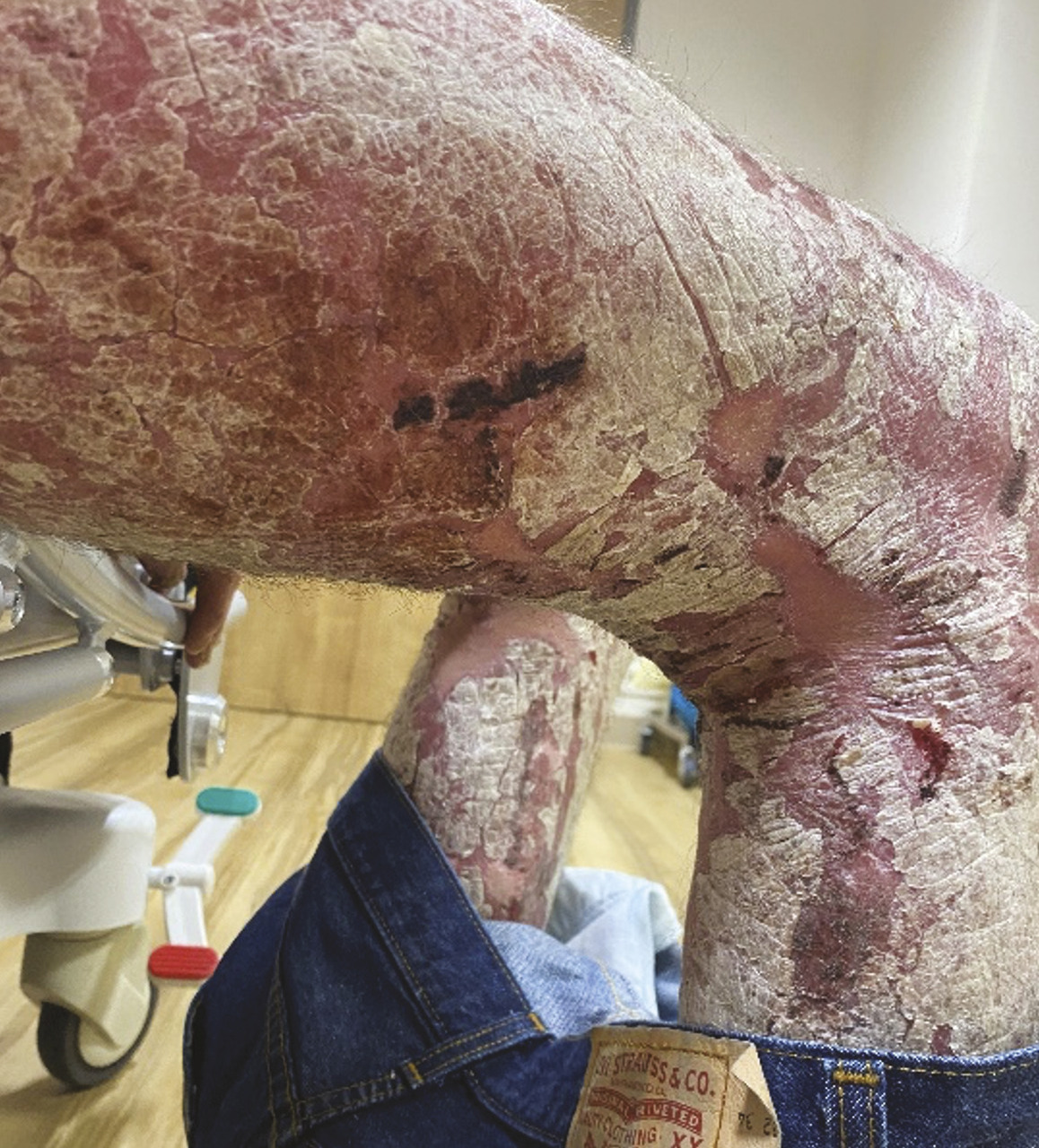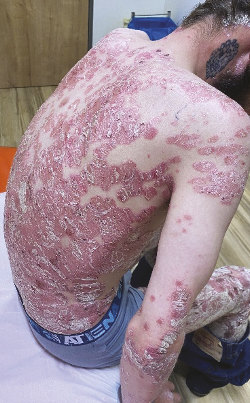 Il est hospitalisé dans le service de médecine interne pour réaliser un bilan biologique complet. Il est mis sous dermocorticoïdes, ce qui conduit à une nette amélioration de son état cutané en quarante-huit heures. Il n’a pas pu bénéficier d’un traitement systémique par rétinoïdes du fait de sa précarité sociale et de l’incertitude quant à la réalisation du suivi biologique nécessaire. Il est sorti d’hospitalisation avec un traitement local seul. Le patient doit être revu pour l’introduction d’une biothérapie de type anti-IL-17 ou IL-23.