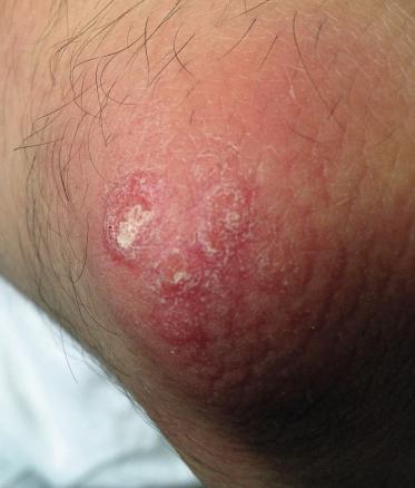 Un homme de 51 ans consulte pour un prurit anal avec du sang rouge à l’essuyage. Il a pour antécédent un psoriasis des coudes. L’examen clinique révèle la présence d’une plage érythémateuse périanale étendue jusqu’au sillon interfessier avec quelques desquamations à ce niveau (