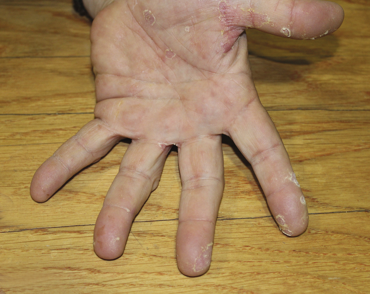 L’atteinte palmoplantaire n’est pas très fréquente (12 % des cas). Elle se caractérise par des lésions hyperkératosiques diffuses ou en îlots, avec une bordure érythémateuse bien limitée. Parfois fissuraires et douloureuses, elles peuvent être localisées (sur les zones d’appui, par exemple) ou plus diffuses. Chez ce patient, les lésions kératosiques bien limitées au niveau des poignets confortent le diagnostic.