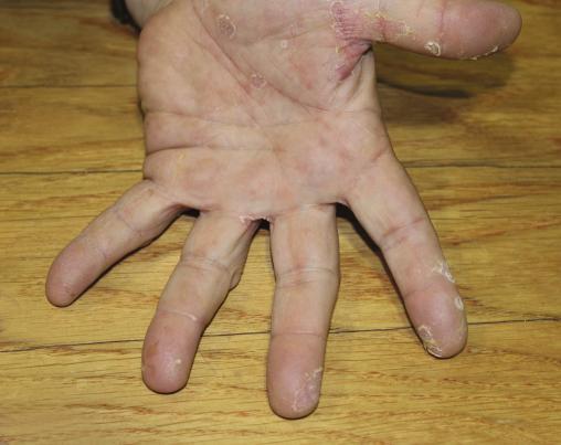 Jean, 48 ans, tailleur de pierre, se plaint de fissures palmaires apparues depuis quelques semaines et d’une desquamation touchant les extrémités des doigts. L’examen montre également des lésions hyperkératosiques prurigineuses au niveau des poignets.