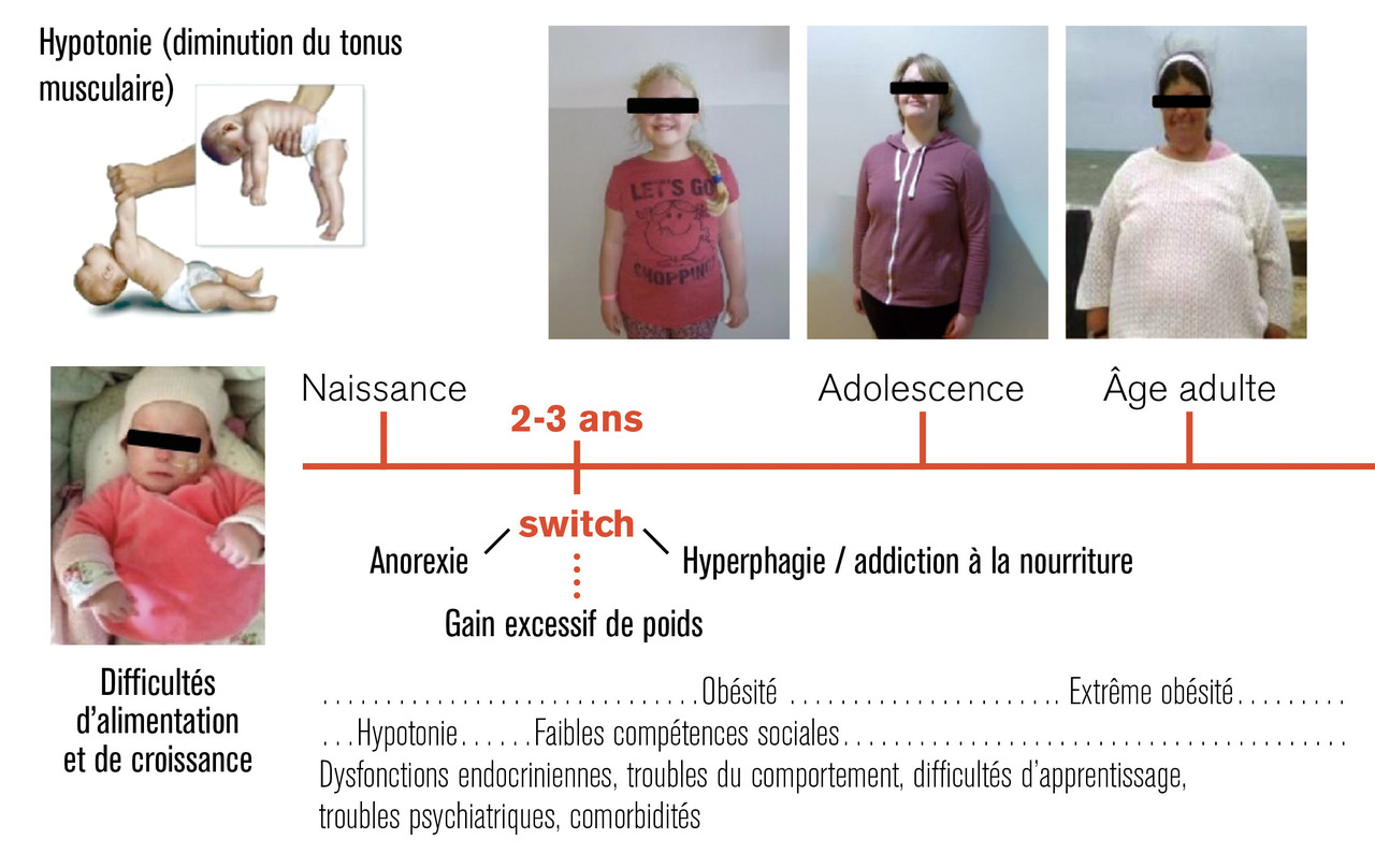 Ce syndrome est un trouble neuro-développemental d’origine génétique (1 enfant sur 20 000 naissances) affectant la région chromosomique 15q11-q13.1 Du fait d’une hypotonie sévère à la naissance et de troubles de la succion-déglutition, le diagnostic est actuellement fait en moyenne à 18 jours de vie en France. Le syndrome de Prader-Willi comprend principalement des troubles endocriniens (dysfonctionnement de l’axe hypothalamo-hypophysaire), des troubles neurodéveloppementaux et psychiatriques. Les troubles alimentaires sont au premier plan, avec une anorexie les premières années de vie et un switch vers l’âge de 2 ou 3 ans, avec ensuite une hyperphagie et une addiction alimentaire entraînant des complications à la fois somatiques liées à l’obésité et comportementales du fait de la pensée prégnante pour la nourriture. Le syndrome de Prader-Willi est marqué également par un niveau élevé d’irritabilité et d’impulsivité, des crises de colère fréquentes, une rigidité de la pensée, des lésions de grattage, des fabulations et des difficultés dans les interactions sociales.2 Sur le plan développemental, on trouve une déficience intellectuelle légère à modérée majoritairement, des troubles instrumentaux (troubles visuo-spatiaux, troubles de l’attention, troubles du langage, de la motricité globale et fine). Les progrès faits récemment dans la connaissance de ce syndrome, le diagnostic et les prises en charge précoces dont le traitement par l’hormone de croissance ont permis une amélioration conséquente de la santé physique et psychique de ces sujets.