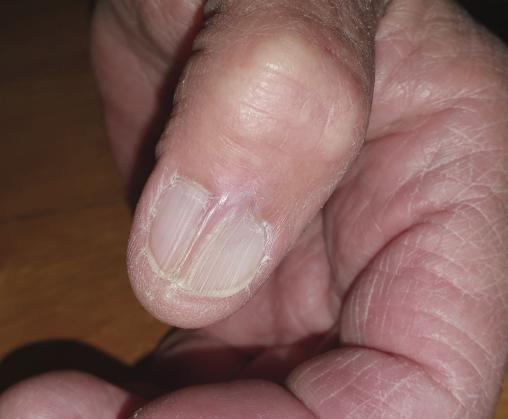 Jean-Philippe, 68 ans, consulte pour une déformation unguéale du premier doigt de la main droite apparue à la suite d’un traumatisme par mauvaise manipulation d’une perceuse (