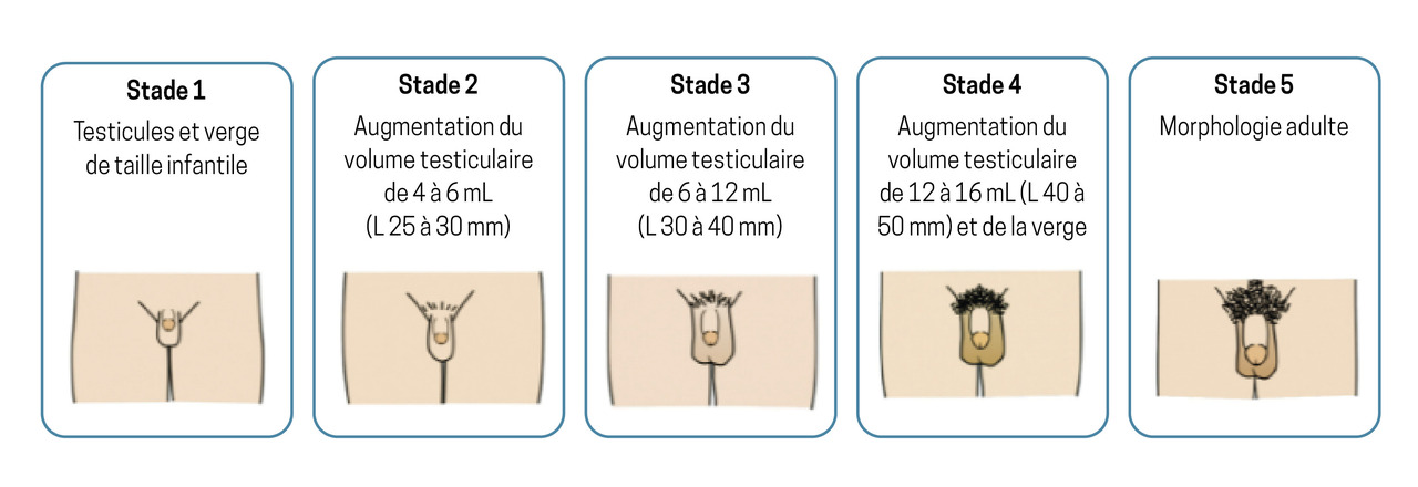 Chez le garçon, la sécrétion de testostérone par les cellules de Leydig est stimulée par la LH, ce qui est à l’origine du développement de la pilosité et de la croissance de la verge ; la FSH entraîne, quant à elle, l’augmentation du volume testiculaire.