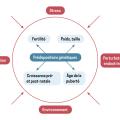 – les facteurs génétiques : les études réalisées avec des jumeaux indiquent que 70 à 80 % des variations de l’âge pubertaire sont expliquées par des facteurs génétiques ;